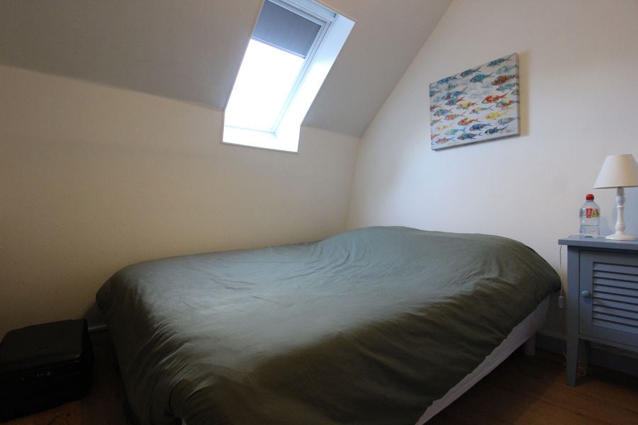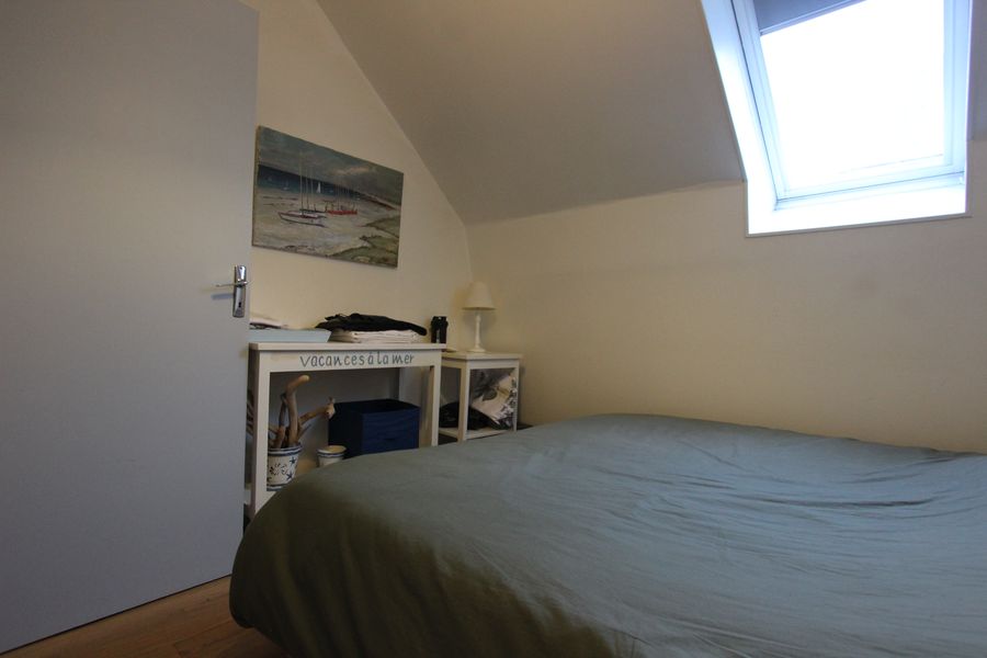 Sa chambre avec rangements est au calme, donnant à l’Est, sur les toitures du vieux centre. La salle de bains accueille un espace buanderie.
