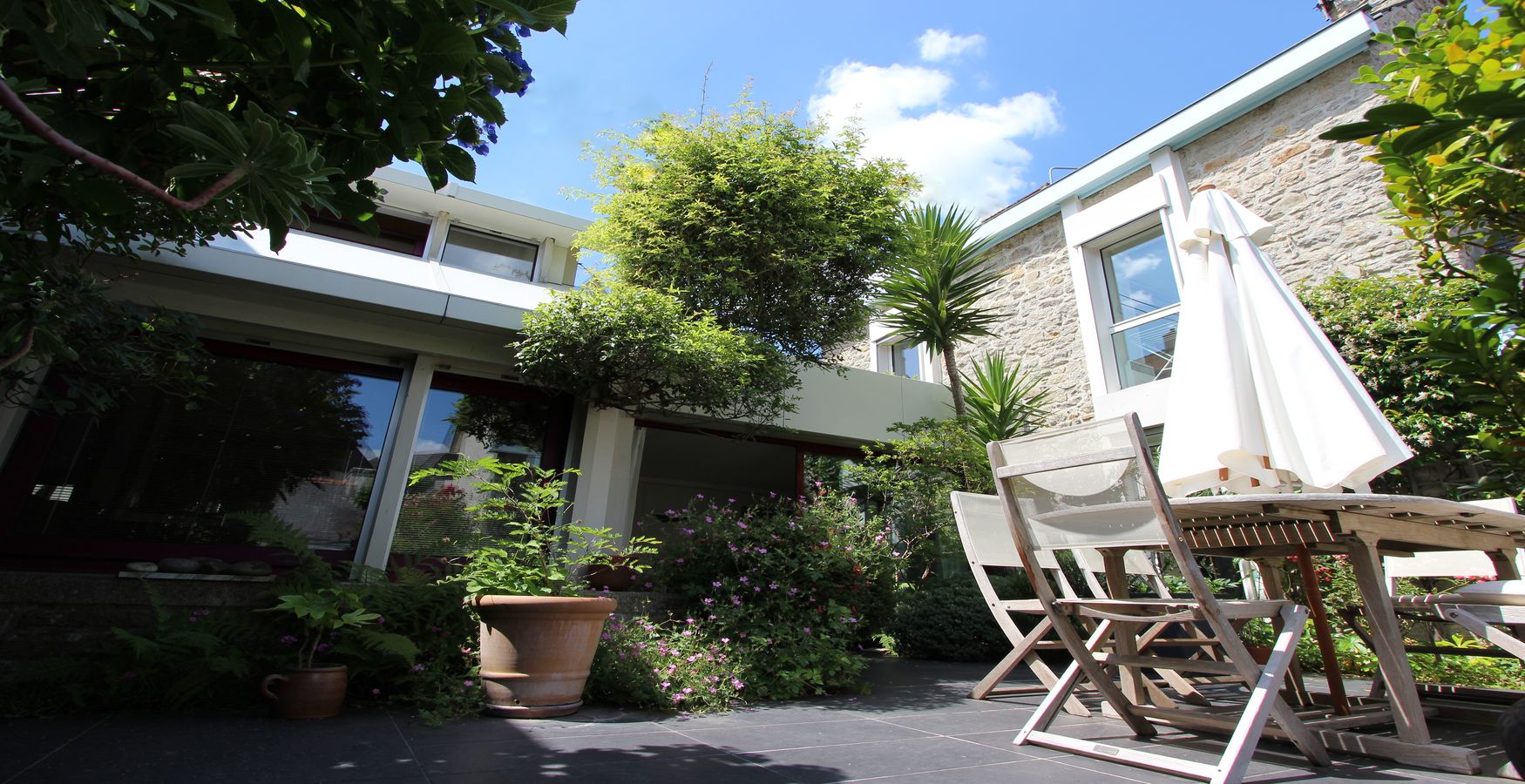 Une pépite d’architecte au centre-ville de Quimper, ” cacher pour mieux dévoiler ” est le premier ressenti dès l’entrée dans les lieux. Viens ensuite, le sentiment d’émerveillement en découvrant dans cette bâtisse de 1990, rénovée et agrandie en 1995, une douceur entre le mélange des matériaux nobles : le bois…