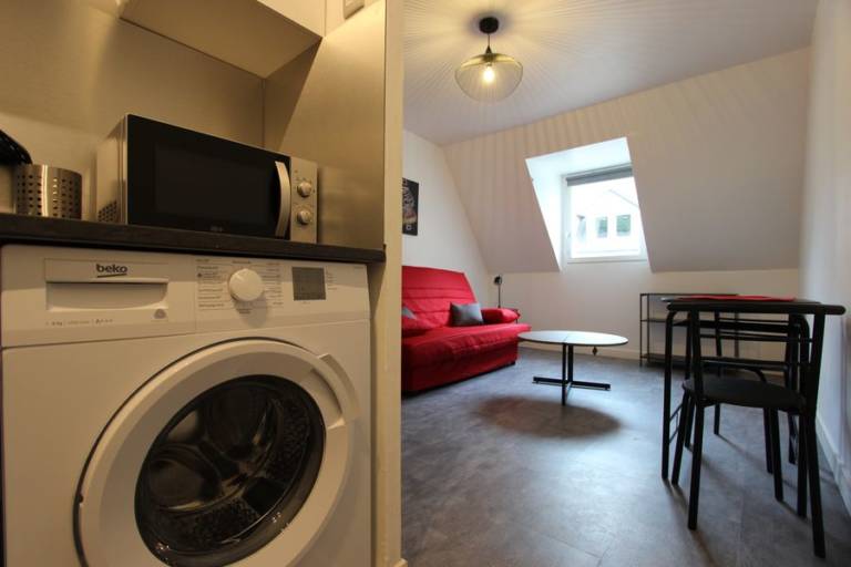 Au 3ème et dernier étage d’un immeuble de charme du centre-ville Quimpérois, cet appartement lumineux est composé d’une pièce à vivre avec de nombreux rangements, une petite cuisine équipée à neuf ( plaque vitrocéramique et réfrigérateur) et d’une salle d’eau avec wc. Un canapé convertible est mis à disposition du…