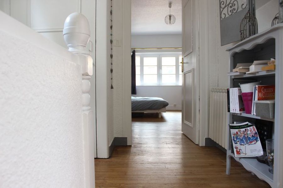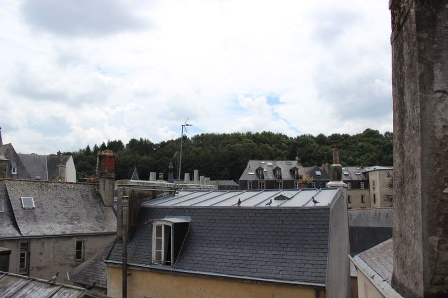 Aux fondations de la petite copropriété ? Les pavés quimpérois! Au troisième étage de l’immeuble ancien, ce Type 2 vous étonnera: un brin atypique, il se compose d’un couloir avec placard/penderie, d’une belle cuisine très lumineuse & équipée (four, plaques induction et hotte), d’un salon-séjour avec vue sur les toits…