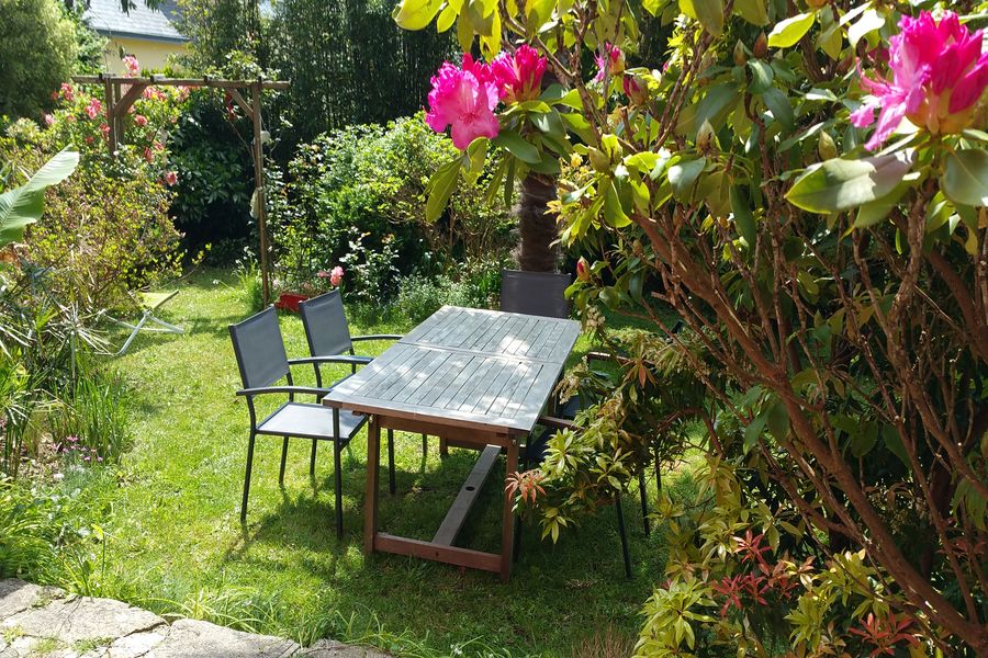 Un jardin intimiste où ancienne glycine, camélia et arbres exotiques se marient parfaitement.