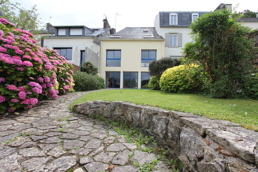 Une situation très recherchée, à moins de 5 min à pied du centre historique et des Halles de Quimper, pour cette demeure de beaux volumes qui s’adjoint un joli jardin bien exposé et un appartement indépendant. Édifiée à l’origine dans les années 30′, la bâtisse a été entièrement restaurée à la fin des années 1980.