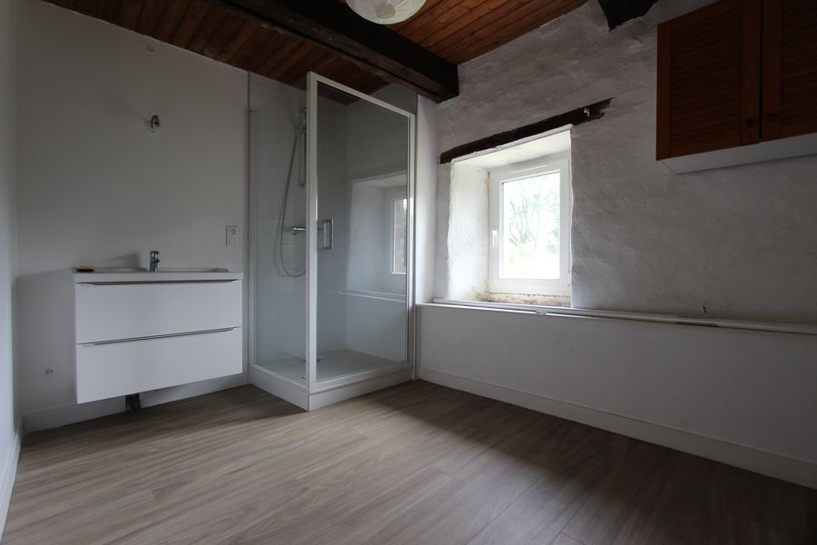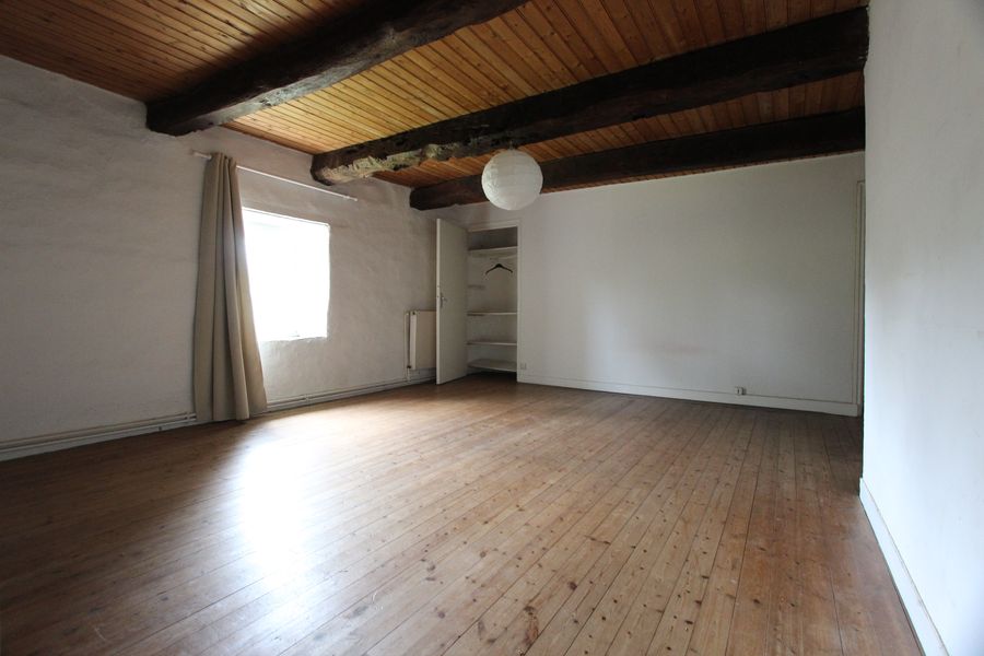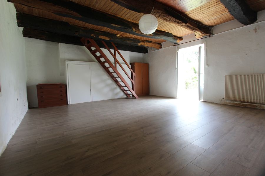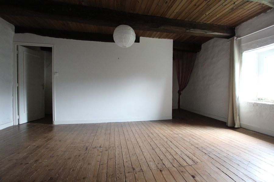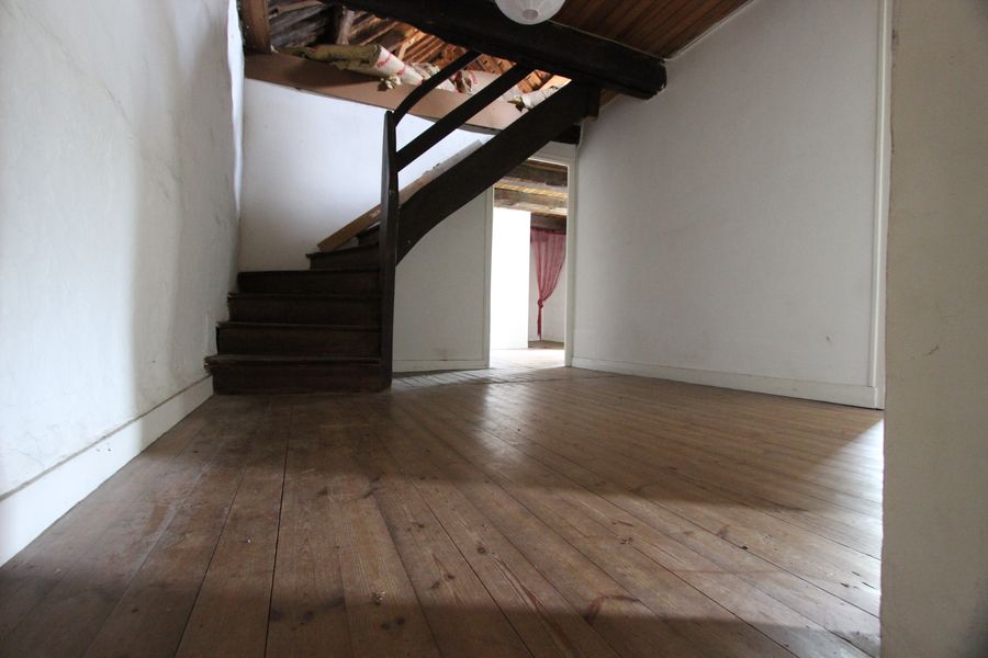 Au premier étage, un vaste palier distribue une salle d’eau récente, ainsi que deux belles et grandes chambres habillées de leurs poutres apparentes et parquet massif. Au second étage, un vaste comble de 60 m², pourrait s’aménager avec sa charpente apparente.