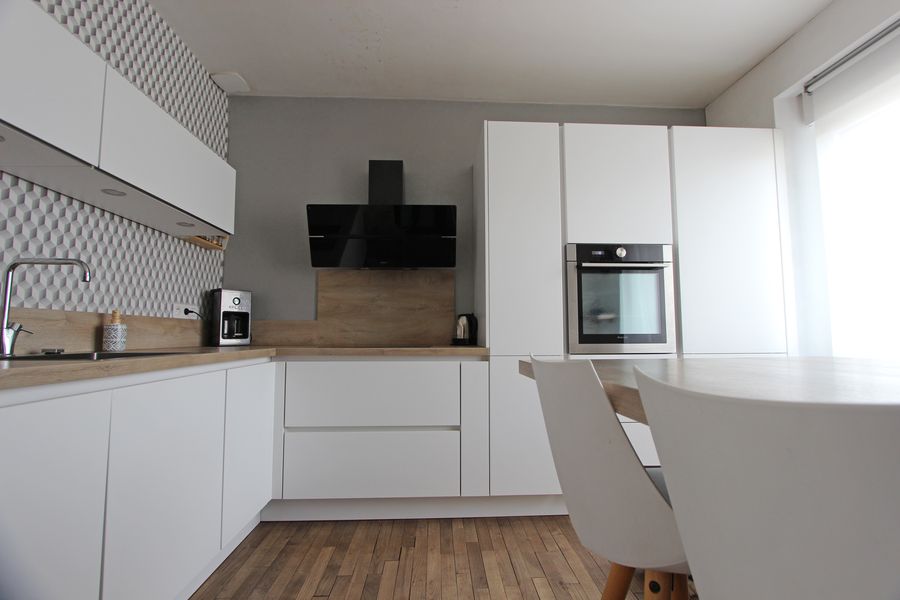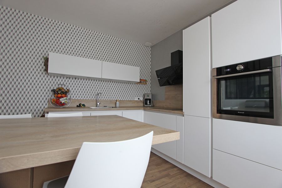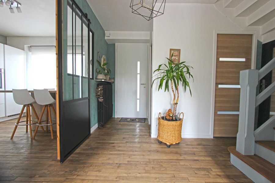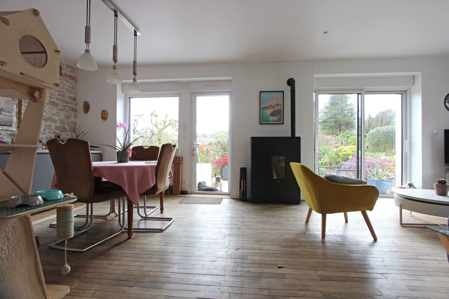 Quelques marches vous mènent vers l’entrée, desservant d’un côté une cuisine agencée récente & le salon-séjour-salle à manger avec poêle à pellets s’ouvrant sur une belle terrasse à la triple exposition Est-Sud-Ouest et sa belle vue dégagée sans-vis-à -vis sur le jardin paysager.